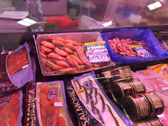 In Kamchatka si nutrono di salmone. Durante le escursioni abbiamo mangiato tipica zuppa di salmone (acqua bollita con un pò di carote e cipolle e un tocco di salmone), ma il top lo abbiamo comprato al mercato del pesce!