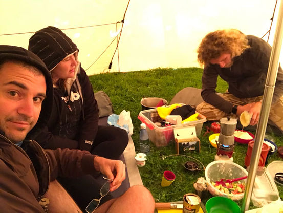 Finalmente arriviamo alla base del vulcano, la guida ci dà degli stivali di gomma e un telo protettivo per la pioggia e ci prepara il pranzo!Ovviamente fa un freddo non indifferente, ci ingozziamo di formaggio e ...lardo e iniziamo l'ascesa!