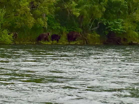 Perchè vi chiederete!la risposta è semplice. I turisti viaggiavano sull'unica strada asfaltata del paese e ad un certo punto ovviamente scendevano dall'auto per passeggiare sul lungo fiume...circa 4 turisti sono spariti, si pensa preda di orsi. Da quel momento il servizio noleggio auto è stato chiuso. Essì, perchè sono gli orsi i veri abitanti della Kamchatka e gli umani li rispettano come in pochi altri luoghi nel mondo. Noi turisti sprovveduti non abbiamo l'esperienza per girare in Kamchatka da soli!!Infatti durante la nostra discesa in gommone sul fiume, eccola là!una bellissima famiglia di orsi, mamma orsa e tre, dico tre cuccioletti!una vera rarità dice la guida (in russo, ma eravamo in compagnia di una turista russa studentessa universitaria aMOsca che parlava inglese), significa che il cibo (salmone o pesce in generale) è presente in abbondanza per permettere a mamma orsa di nutrire tutti i cuccioli!